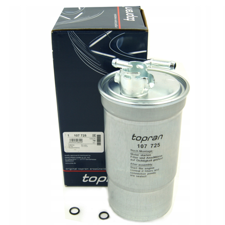 Aprašymas: „Topran 107 725“ yra vienas populiariausių dyzelino filtrų, skirtas VAG grupės automobiliams su legendiniais 1.9 TDI ir 2.5 TDI varikliais. Šis filtras užtikrina aukštą filtravimo lygį, būtiną tiek paprastoms įpurškimo sistemoms, tiek jautresnėms „Pump-Düse“ (purkštukas-siurblys) sistemoms. Komplekte esantys sandarikliai garantuoja hermetiškumą, o apatinis kaištis leidžia patogiai pašalinti kure susikaupusį vandenį bei nuosėdas.