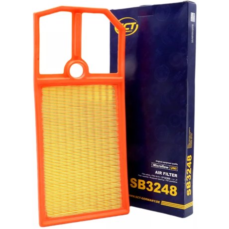 Aprašymas: SCT Germany SB3248 yra specifinės pailgos formos oro filtras, skirtas plačiam Volkswagen Group (VAG) automobilių ratui, ypač modeliams su mažesnio tūrio benzininiais varikliais (pvz., 1.4 ir 1.6). Dėl savo išskirtinio ilgio (418 mm) ir nedidelio aukščio, šis filtras užtikrina tolygų oro paskirstymą įsiurbimo sistemoje. Naudojamas kokybiškas filtravimo popierius efektyviai sulaiko smėlį, dulkes ir kitus nešvarumus, užtikrindamas švarų oro padavimą ir saugodamas droselinę sklendę bei cilindrų grupę nuo užteršimo.